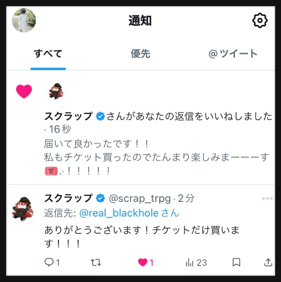 って向こうがフォローしてくれないと直接返信できない仕様になってるから、引用リツで呟いたら直接スクラさんから「ありがとう、チケット買います!」って返信きてくれた。多分私死ぬんだわ。