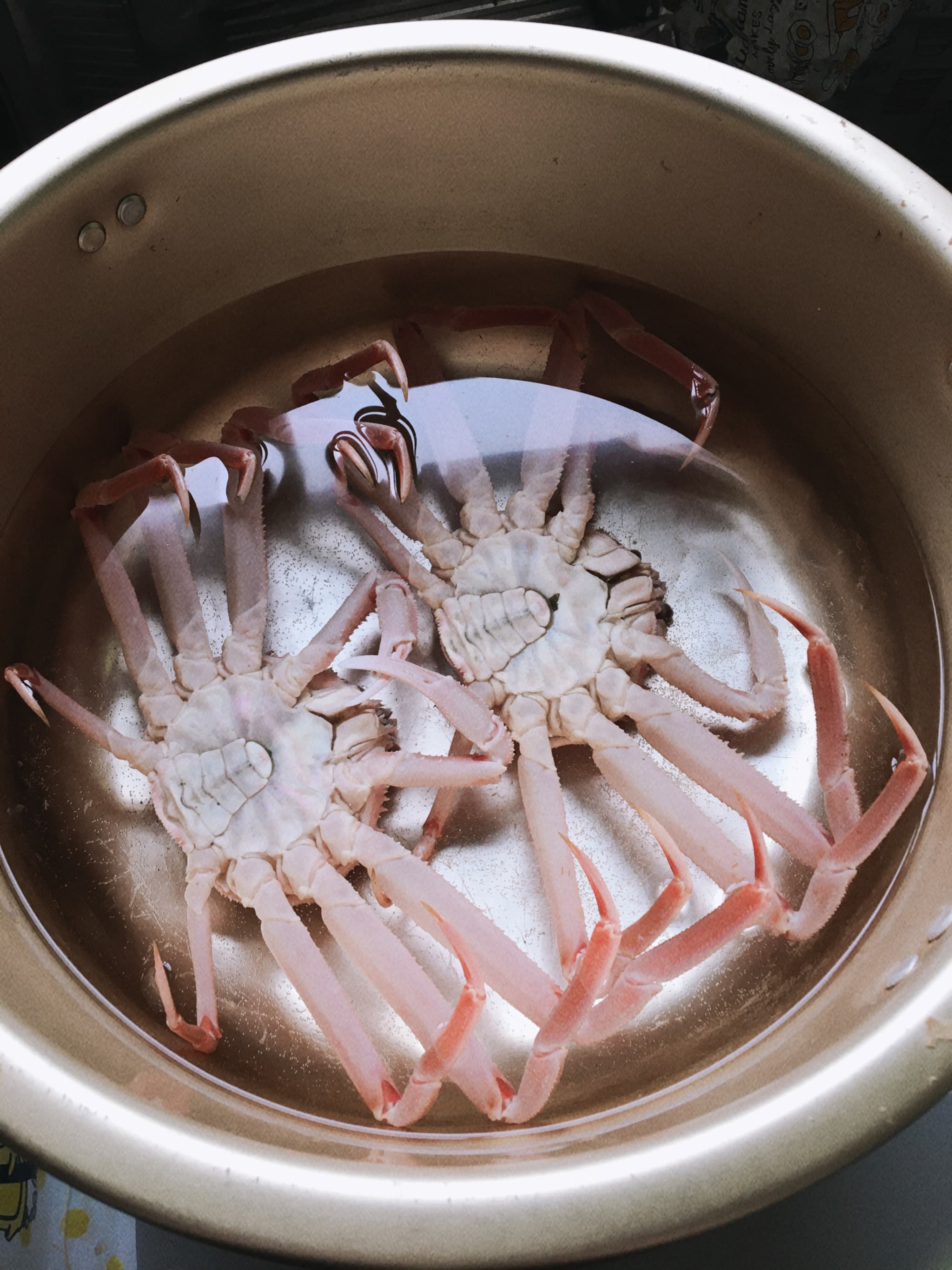 生きていたらカニは「匹」と数えるけど、召された後からは「杯」になるのですが、この微妙な境目の状態でお湯にドボン。