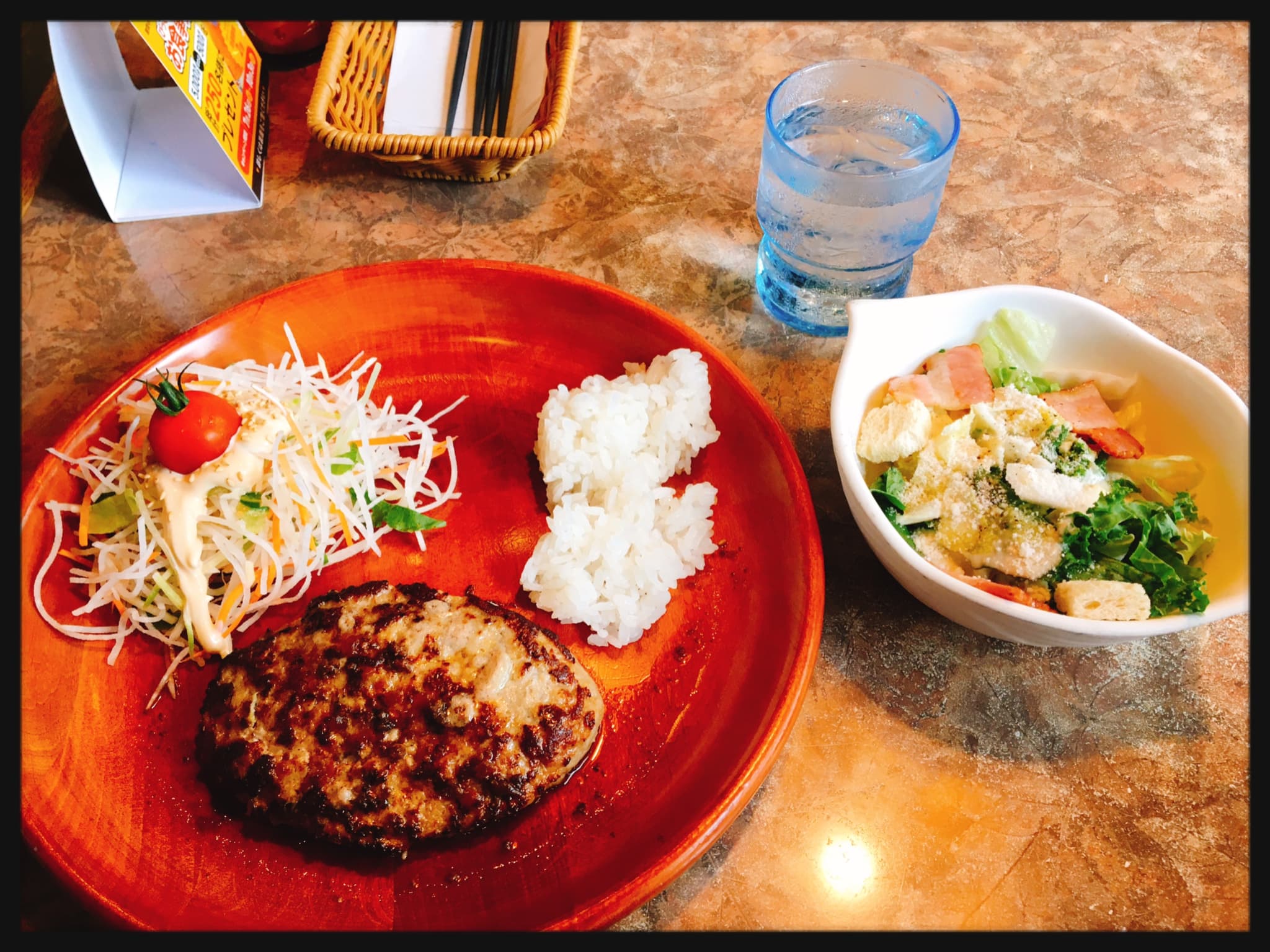 トッピングなしのライスなしレギュラーバーグディッシュ(150g)+シーザーサラダ。わざわざライスなしにしたのに、おとんにライス分けられた(笑)