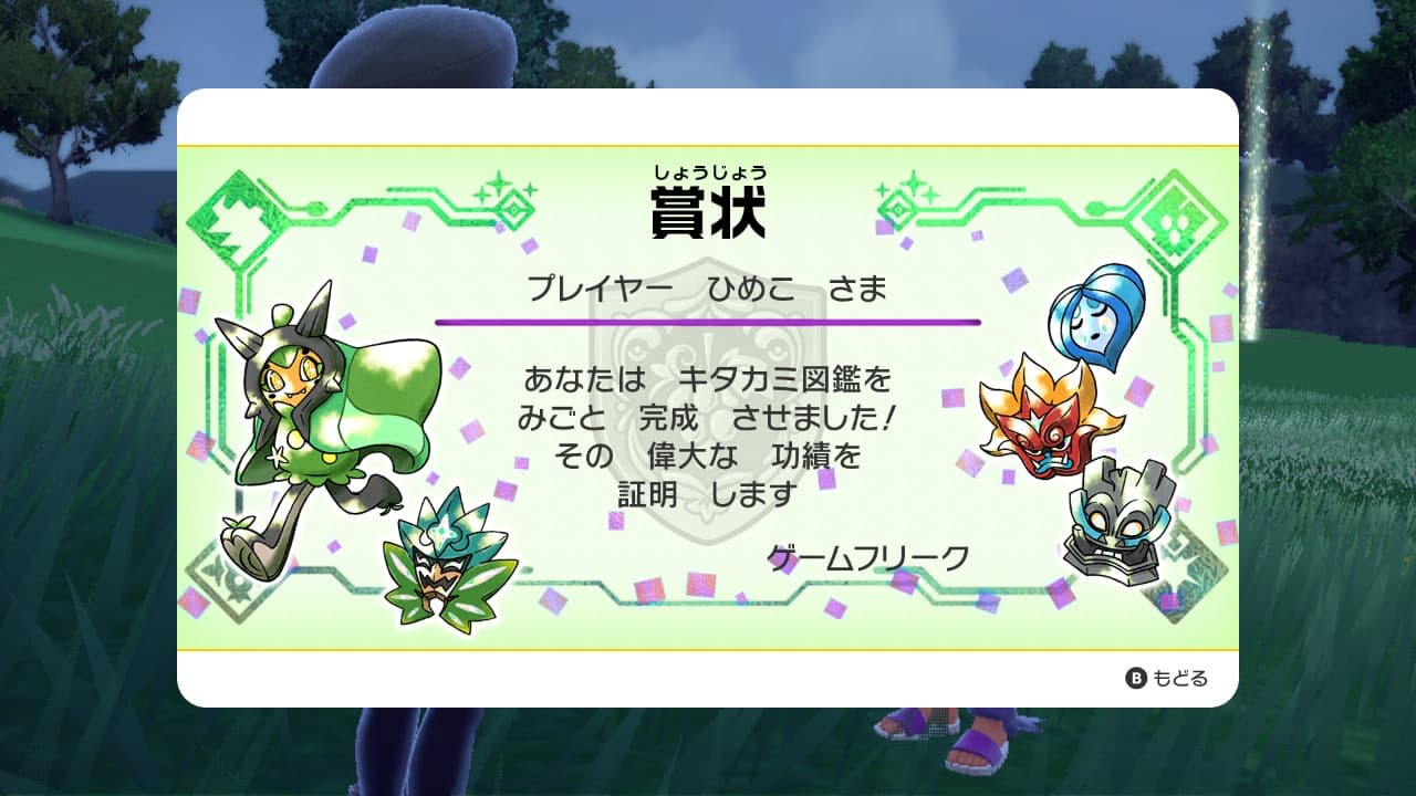でね、そのテラレイドバトルしたお陰でキタカミ図鑑が無事埋まりました。バージョン限定ポケモンもテラレイドバトルは関係ないし。