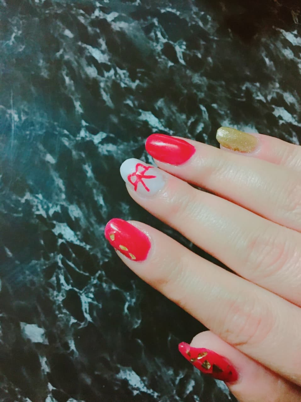 紅白柄にして中指にリボンつけました。