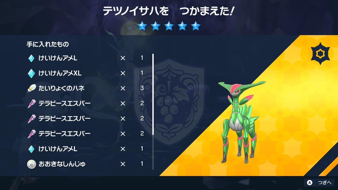 その後2人で期間限定でゲットできるウネルミナモ、テツノイサハもゲットできました。テツノイサハに苦戦を強いられて、予想外に何度か追い出されました(笑)