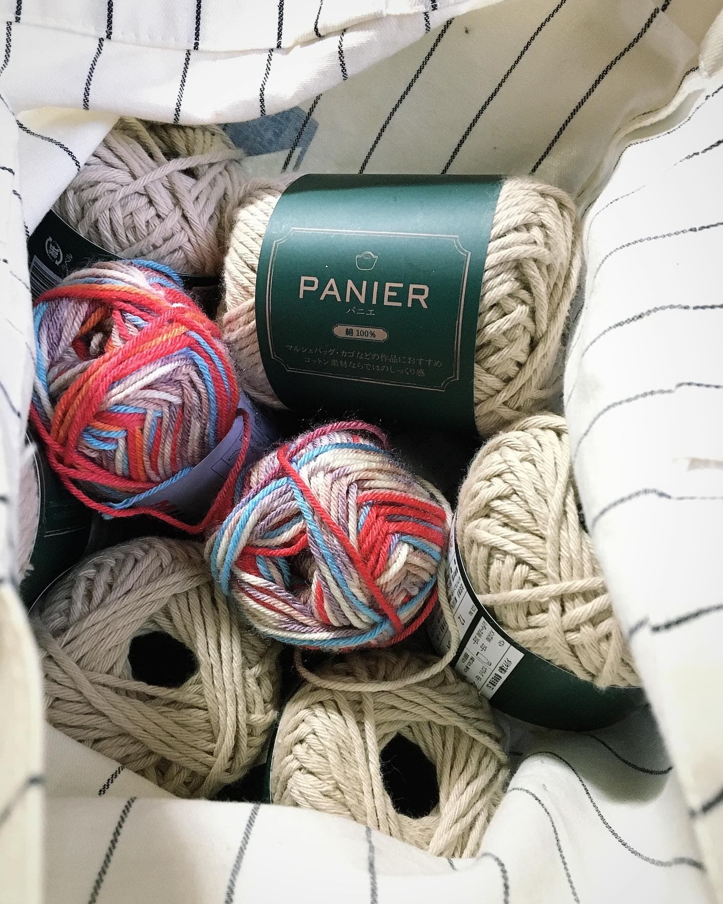 はい、というわけでどっさりと買い込みましたよコットン系の毛糸。ショルダーバッグ編みたい症候群に陥っているせいか、もうむっちゃくちゃ悩みまくって悩みまくって、それと店側の在庫と相談しながらカゴにポイポイ・⌒ ヾ(*´ー`) と投げ込みました。