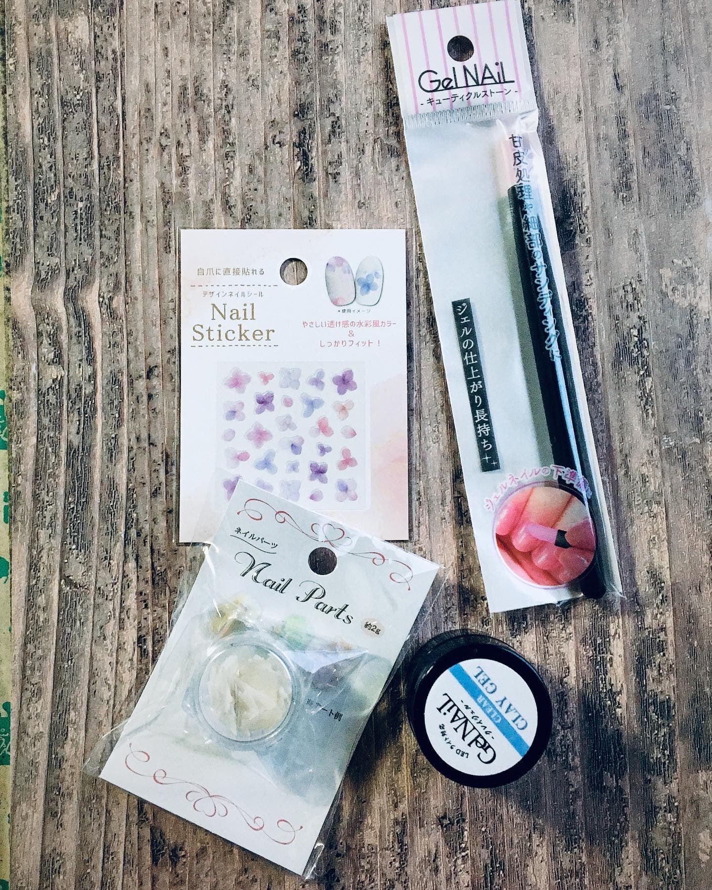 ワンホンネイルのあとは、紫陽花ネイルしたいなーって思っていたので、それに滅多にセリアで買い物出来ないから紫陽花ネイルシール見っけた瞬間にスポコーン!!と投げ込みました。