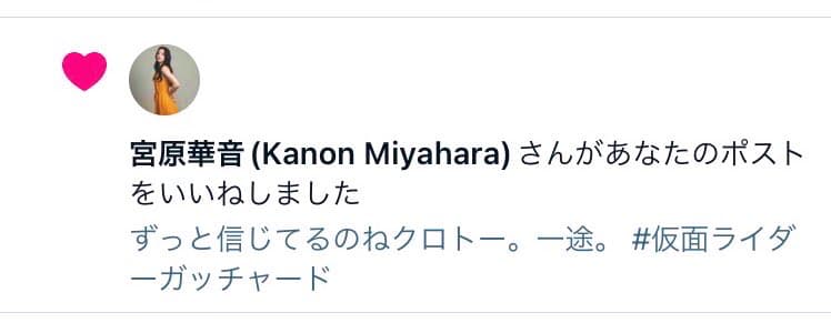 どうでもいい自慢なんですけど、記念にスクショしておいたんですけど、仮面ライダーガッチャードに出演なさっている女優さんが、私のツイートにいいね♡を押してくださったのですごい嬉しいです。