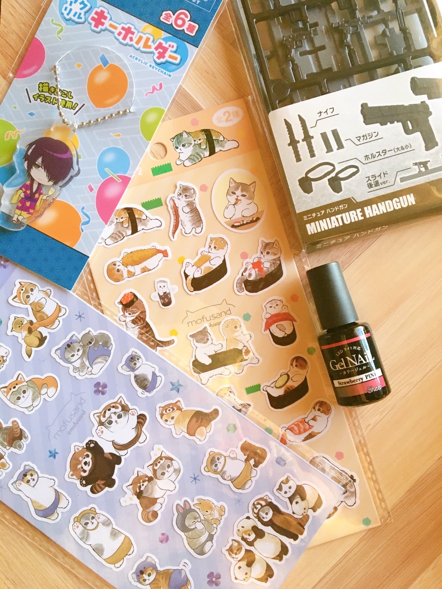 mofusandのシール2種類と銀魂の高杉さんのキーホルダー、ミニチュアハンドガン、カラージェルです。
