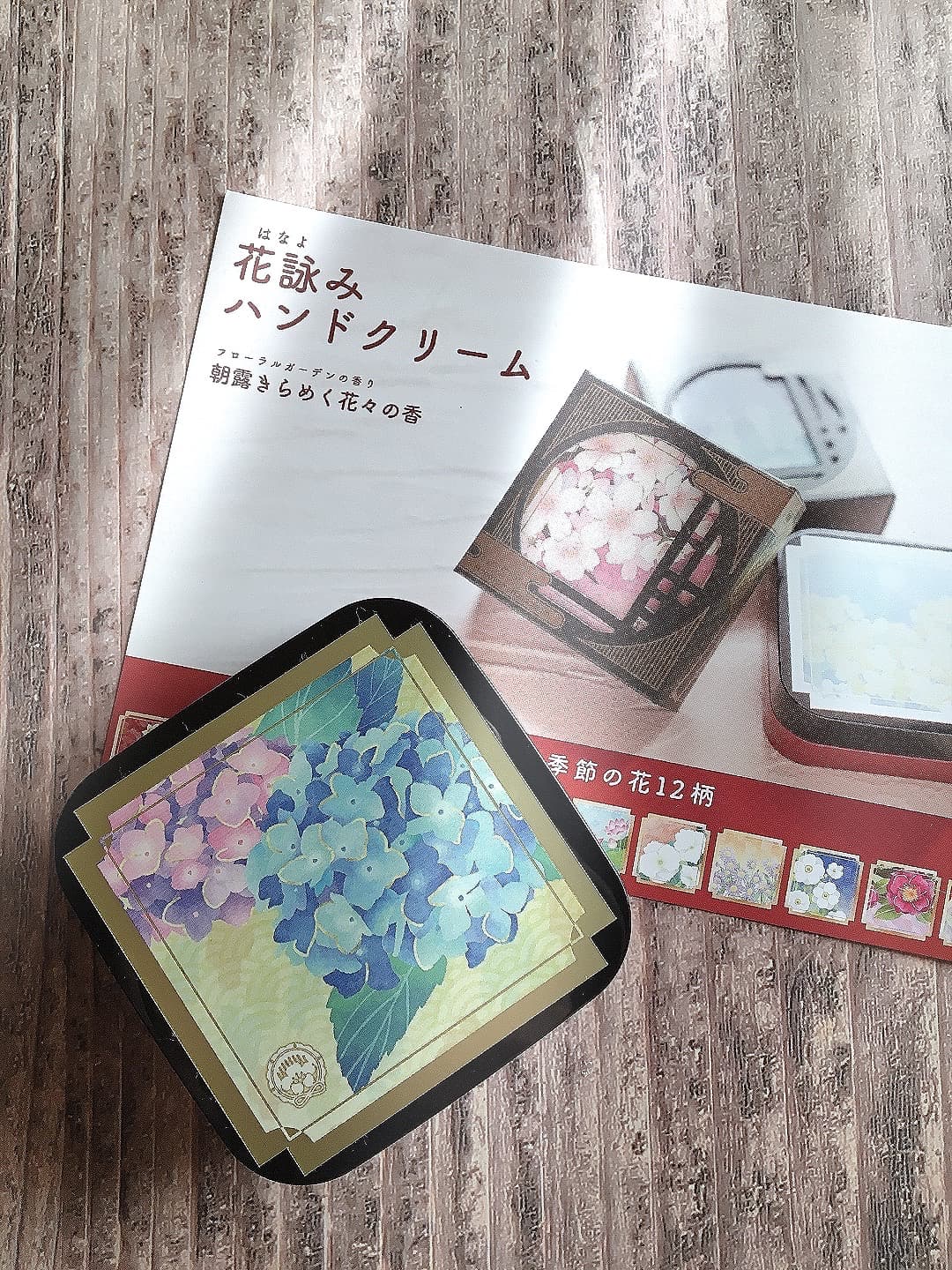 友達のりぃちゃんからハンドクリームが届きました!お湯で剥せるでお馴染みの四季彩まといネイルを売っているメイドイン京都のハンドクリームです。香りは全て同じなんですけど、パッケージが12ヶ月分あるので、私は6月生まれのジューンブライドだから紫陽花パッケージをチョイスさせて頂きましたです。可愛い。