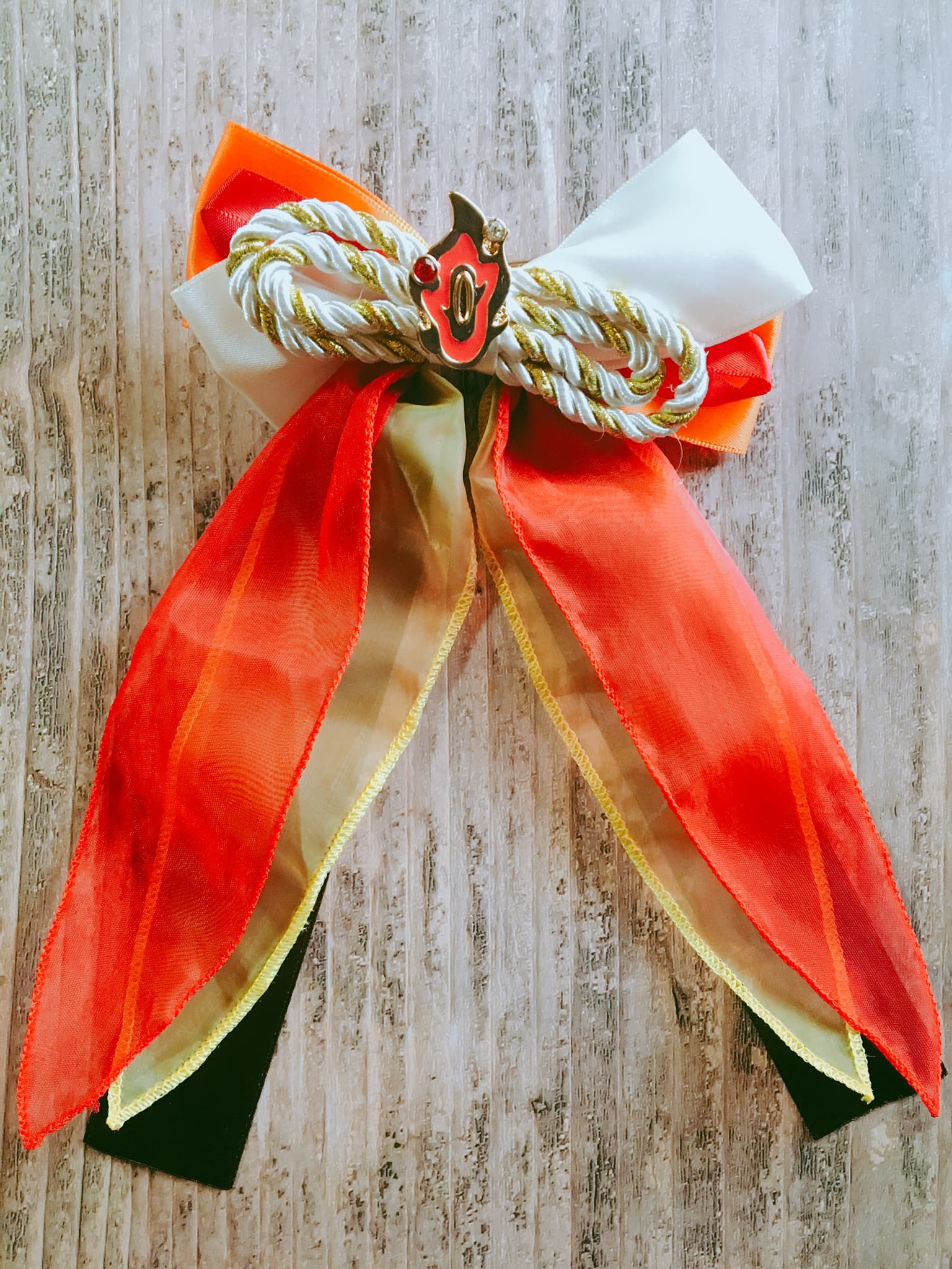 なにこれエモい・・・いや待って煉獄さんの日輪刀の鍔なんだけど。胸に来るんだけど!心臓に来るよこんなん。日輪刀の鍔あるよ、やだぁぎゃああああ色合いがすっごい素敵。でも和が入っていてそこがいいなぁこれ。リボンの端っこが尖ってるの珍しいですね、なんか羽織のギザギザ具合を思い出す・・・うわぁぁん、炎っぽい。