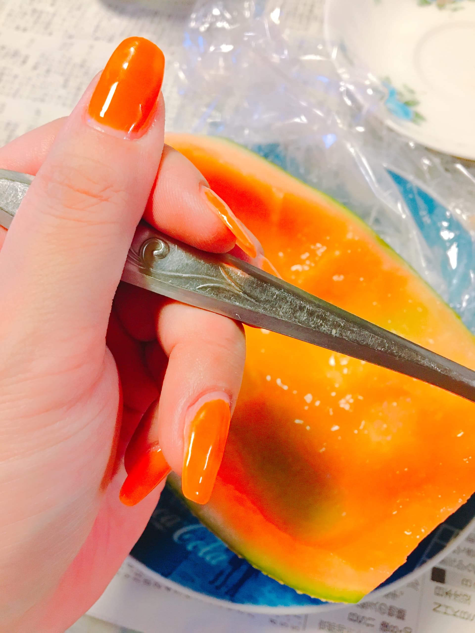 激甘で果汁が本当ジュース!まじ今年のメロン当たりです。で、食べながら気がついたんですけど、赤肉メロンの果肉とネイルの色々結構似てた(笑)