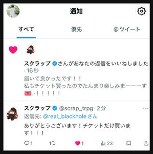 って向こうがフォローしてくれないと直接返信できない仕様になってるから、引用リツで呟いたら直接スクラさんから「ありがとう、チケット買います!」って返信きてくれた。多分私死ぬんだわ。